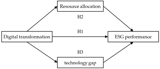 Second, from the perspective of Stakeholder Theory (ST), digital transformation can considerably enhance the transparency and decision-making effectiveness of corporate governance. Rooted in business ethics and organizational management, ST emphasizes that firms should generate value for a diverse range of stakeholders rather than solely pursuing their own interests. [46,47]. In this context, the implementation of technologies such as blockchain has increased the traceability and transparency of information, allowing shareholders, creditors, and regulatory bodies to more readily access accurate company data, thereby lessening information asymmetry and managerial self-serving behavior [48]. On the one hand, this enhanced transparency incentivizes companies to proactively address their social responsibilities, cultivating a stronger brand image [49]. On the other hand, the growth of enterprises is often restricted by vacancies in key positions [50] or a lack of talent with critical skills [51]. As essential internal stakeholders, employees’ competencies and stability play a critical role in the long-term development of a company. Firms with advanced digital governance can harness big data analytics to identify talent and leverage collaborative platforms to engage with them seamlessly [52], thereby addressing challenges encountered in advancing ESG initiatives. According to the aforementioned analysis, this paper puts forth the hypothesis: