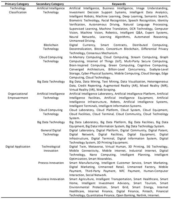 This study’s key explanatory variable is the degree of digital transformation (Dig). Adapting the methodology of Zhen et al. [82], it is computed by ascertaining the ratio of digital transformation-related keywords in the “Management Discussion and Analysis” part of the annual report and then multiplying this ratio by 100. This proportion is derived by dividing the total number of digitalization keywords by the total word count of this section. These keywords, 135 in total, are divided into three primary dimensions and eleven secondary dimensions, as shown in Figure 2. This variable is intended to reflect the digital practices described by companies in their annual reports and their level of integration into management and operations, allowing for analysis of their influence on business performance and compensation structure.