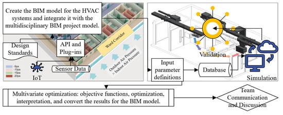 Building Information Modeling and digital twins for real-time control in healthcare and medical facilities enables dynamic monitoring and predictive management [40]. However, the digital twin (DT) prototype presented in the study [40] is primarily a conceptual framework with four theoretical scenarios rather than a fully implemented system. Hence, the technologies require a high level of technical expertise. Sourcing appropriate sensors that meet the DT’s specific requirements can also be difficult. The study [40] lacked real-world implementation due to restricted access to critical healthcare facility data, systems, and equipment. Additionally, bidirectional coordination (a key feature of DTs) may face resistance due to the sensitive nature of hospital operations and concerns over the external control of critical systems. In another example, BIM digital twins integrated real-time sensor data to create a dynamic virtual representation of hospital spaces for infection spread analysis and mobile asset management [41]. The airflow patterns were visualized to identify potential hotspots for infection spread and evaluate the effectiveness of various mitigation strategies. The system’s real-time capabilities allowed for continuous monitoring and prompt adjustments to environmental controls. BIM frameworks for indoor environments should utilize data-driven methods to support applications like real-time HVAC system optimization, predictive maintenance through IoT integration, and exploring design scenarios for energy-efficient building layouts [27]. Current deficiencies include (1) incorporating graph convolutional neural networks to refine spatial feature analysis and improve predictive accuracy [27], (2) automating critical steps using AI (e.g., natural language processing for knowledge extraction) [42], and (3) implementing real-time BIM updating with as-built data integration [42,43,44,45]. While these digital twin applications demonstrate promising advancements, their effectiveness relies heavily on integrating heterogeneous data sources, particularly for critical building systems like HVAC.