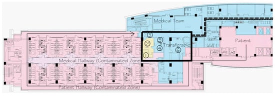 Figure 2 shows that a transferrable area has been set up for each floor wing to accommodate the function changes. All the patient rooms are convertible to negative pressure. Areas 1, 2, and 3 are pass-through changing and buffer rooms that meet basic usage requirements for routine operation plans of the ward suite. Area 1 is a buffer room, Area 2 is the first changing room, and Area 3 is another buffer room. These three areas are for routine operations. Area 4 is the second changing room, Area 5 is the third buffer room, and Area 6 is the dressing room. These three areas can be used for offices and storage in routine operations and are converted to designated usages when the hospital switches to epidemic prevention and control mode. The process of taking off personal protective equipment is thus: hand hygiene → taking off shoe covers → hand hygiene → taking off isolation clothing and outer gloves → hand hygiene → taking off goggles → hand hygiene → taking off protective clothing and inner gloves and boot covers → hand hygiene → taking off protective masks → hand hygiene → taking off hats. Hence, the isolation clothing and outer gloves are taken off in Area 2, and the protective gears are taken off in Area 4.