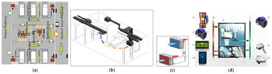The items in Figure 3d are explained here: 1—the direction of intake air, 2—the direction of intake air, 3—buffer room, 4—the restroom, 5—the main air conditioning supply outlet, 6—the secondary air conditioning supply outlet, 7—the patient room, 8—airflow direction, 9—exhaust vent, and 10—the direction of exhaust air. The device details are thus: 11—Venturi valve with sensors for precise and accurate airflow control (e.g., [66], 12—high-precision volume flow control (e.g., [67]), 13—nursing station monitoring unit, 14—connected control app showing the air pressure, 15—wall mounting temperature and humidity sensor, and 16—airflow sensor.