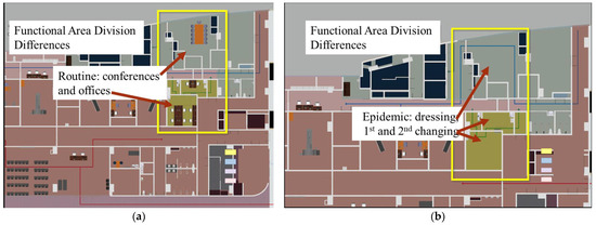 Typically, the department includes essential dressing rooms, while other areas, such as film reading offices and warehouses, are planned as flexible auxiliary spaces (see Figure 4a). During an epidemic, functional rooms are restructured to align with infection control requirements, including designated areas for dressing, entry, buffering, first and second gown removal, and exit buffering. These modifications ensure compliance with airflow organization and zoning management standards, meeting isolation and protection needs. In epidemic scenarios, non-essential sanitary passage areas are repurposed as medical protection spaces to enhance infection control measures (see Figure 4b). During normal operations, these areas revert to auxiliary functions. This flexible design optimizes the department’s usability, ensuring efficient doctor-patient flow while maintaining stringent isolation and safety protocols during outbreaks.