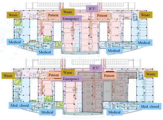 Additionally, precise adjustments to the department operation plans can be made according to the actual epidemic situations, for example, when a pandemic happens. More accurate modeling and simulations were carried out to streamline the closed-loop scope and fine-tune zoning management while addressing the personalized medical diagnosis and treatment needs of special patients. During a pandemic, the following departments and units are in operation, resulting in a total of 12 distinctive operation plans. The north side of the hospital includes the Radiation Department (on the first floor or 1F); Hemodialysis, Blood Testing, and Transfusion (2F); Pathology (3F); inpatient wards (4F–13F); and basement (laundry and sewage treatment, nuclear medicine, and radiotherapy center). The south side includes ICUs (4F), operation rooms (5F), and the Central Sterile Services Department (5F). The following departments and units of the south side are closed when a pandemic happens, resulting in a total of 18 operation plans. On 1F are outpatient areas, the emergency department, registration and payment areas, outpatient/inpatient pharmacy, the intravenous preparation center, and blood collection reservation areas on the south side. 2F has an outpatient area and emergency department. 3F has an ultrasound, a functional examination department, a respiratory endoscopy, and an outpatient area. 4F has an outpatient area and an interventional center. The Endoscopy Center on the 3F of the north side and all the public corridors and spaces are closed.