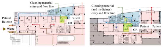 The surgical area is divided into three zones, a negative-pressure surgical zone, a positive-pressure surgical zone, and an interventional surgical zone, to achieve regional divisions for different periods and different usage situations. The upper part of Figure 5 shows that patients with non-respiratory infectious diseases are admitted during routine operations. During the epidemic, only the negative-pressure operating area is open to admit patients with respiratory infectious diseases (see the lower part of Figure 5).