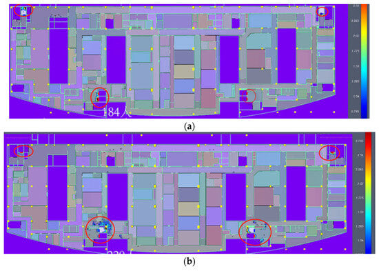 Figure 8 presents the airflow simulation analysis of negative-pressure wards under two scenarios. Figure 8a depicts airflow velocity during routine operations, where the relative velocity in the patient room ranges from 0.000353 m/s to 0.323 m/s. Less than 5% of the room’s cell area exhibits a relative velocity at the upper range of 0.323 m/s.