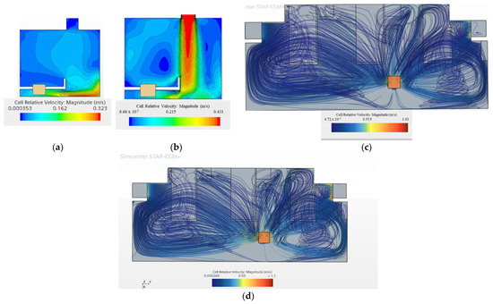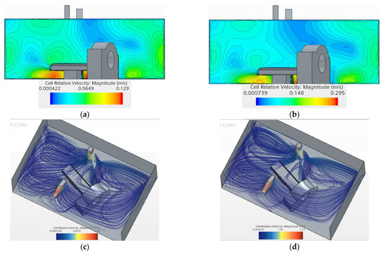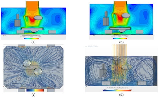 The simulation of airflow in a negative-pressure operating room is shown in Figure 10. According to the characteristics of routine time (Figure 10a,c) and epidemic (Figure 10b,d), the ventilation frequency is adjusted to meet the various treatment tasks. The cell-relative velocity magnitude ranges from 2.46 × 10−6 m/s to 0.0298 m/s, indicating a relatively stable airflow with minor variations. During epidemic operations (Figure 10b), the range increases from 9.9 × 10−6 m/s to 0.0532 m/s, reflecting a higher airflow rate designed to meet stricter infection control requirements.