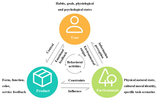 In the early stages of product design, users often struggle to accurately articulate their real needs, making it challenging for designers to grasp the core user requirements, leading to deviations in the design direction. During this phase, the study of user service touchpoints is crucial for uncovering user needs and enhancing the product service experience. The significance of each service touchpoint varies with different user experience contexts [21,22]. Wang [23] introduced service design innovation methods into the design of smart home terminal products, proposing a user service touchpoint correlation model to identify new design opportunities by analyzing user service touchpoints and their connections to user behavior. Bolton [24] guided e-commerce platform service experience design by analyzing the relationship between user service touchpoints and service quality satisfaction. Zhang [25] argued that even when encountering entirely new product forms, users tend to associate them with symbolic elements based on their perceptual memory, demonstrating the connection between user service touchpoints and Kansei cognition. Gentner’s research [26] suggested that Kansei cognition is centered around individual subjective psychological activities, while the overall experience encompasses users, interaction behaviors, environments, etc. The Kansei–experience framework, formed by the two, can describe how users interact with products in a given environment. As Schilit [27] proposed in “situational theory”, the subject of study is the entities involved in the development process, including individuals, related users and products, external environments, and behaviors, as shown in Figure 1.