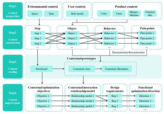This paper conducts situational analysis of the product in four steps, as shown in Figure 3. Context preparation: determine the research objectives and scope, list potential sub-situations around user context, product context, and environmental context, and intervene in the process of collecting situational data. Context construction: Through surveys, interviews, on-site observations, and experiential experiences, gather relevant information on users’ activities, and organize information effectively. After collecting the data, organize user-product-environment-behavior touchpoints based on the timeline of events and integrate the situational system for this task. Explore all user pain points under each specific touchpoint. Context reading: discuss and analyze the primary situational data obtained, propose corresponding situational prototypes, deconstruct pain points, re-evaluate each touchpoint, and finally generate situational stories and extract explicit and implicit needs within the situational task. Context improvement: summarize the situational optimization directions, develop solutions based on user needs, compare the optimized situation with the original situation, and address any gaps, building a requirement model that meets user expectations for subsequent satisfaction validation of the context demand optimization model.