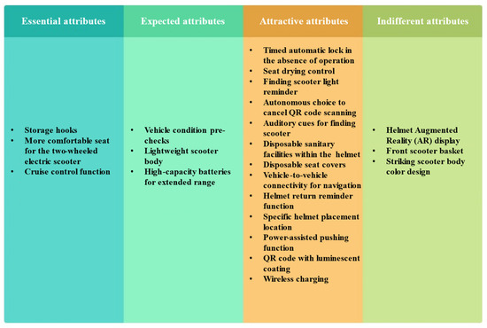 However, the promotion of STWESs in various regions is subject to a range of objective factors and subjective preferences. Safety concerns play a significant role in the adoption of shared two-wheeled electric scooters (STWESs). Bieliński and Agnieszka’s survey [2] identified helmet absence, technical malfunctions, and difficulties in locating scooters as key barriers to adoption in Polish cities. Additionally, Bakker’s research [9] highlights that regulatory improvements and infrastructure development contribute to a safer and more attractive TWES ecosystem. While these factors are critical, this study primarily focuses on optimizing STWES product design to enhance user experience and functionality. Bakker’s research [9] suggests that improving relevant policies and regulations can enhance the utilization of TWESs, with an emphasis on increasing their attractiveness and safety. Bieliński and Agnieszka’s survey [2] of Polish cities identified factors hindering user adoption of STWESs, including difficulties in finding available scooters nearby, technical malfunctions, poor comfort, hygiene issues, and the absence of helmets (related to safety concerns). Thuy and Hong’s study [10] in Hanoi, Vietnam, found that the preference factors for TWESs among high school and college students included economic considerations, convenience of use, environmental friendliness, and design aesthetics. As the market and cost structures become more transparent, and suppliers of components mature, the core technology and external appearance of TWES tend to become more homogeneous. However, influenced by the experience economy, consumer demands are becoming increasingly diversified and personalized [11], leading to a mismatch between supply and demand. Moreover, studies suggest that individual factors such as gender, as well as the perception of the built environment, may influence user attitudes toward shared mobility products, including STWESs. These contextual dimensions are important for understanding differences in adoption and usage patterns across demographic groups [12,13]. Consequently, the improvement and design of functionalities and aesthetics of TWESs have become a focal point in the electric scooter industry at present.
