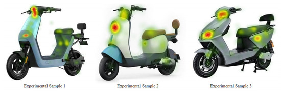 Three different types of two-wheeled electric vehicles, representing turtle-type, ox-type, and eagle-type designs, each encompassing all common design elements, were selected as test samples. Based on eye-tracking heatmap analysis (Figure 6), the visual attention of campus users focused on the headlights, handlebars, front face, body, and seat. In combination with the results from the previous survey, the study selected the body, seat, front face, handlebar, and headlight as the five major fundamental design elements for STWESs.