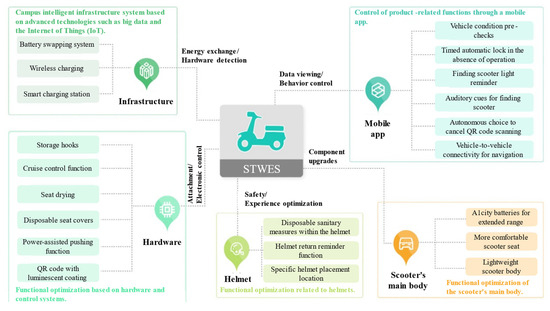 Referring to the optimization model for contextual requirements developed earlier, various attribute-based functional optimization requirements were obtained. These were categorized as basic infrastructure functions, integrated mobile control functions, hardware/chip functions, helmet-related functions, and main body functions. The interrelations and practical operation processes of these categories were taken into account, and a functional system diagram for the campus STWESs was developed (Figure 9).