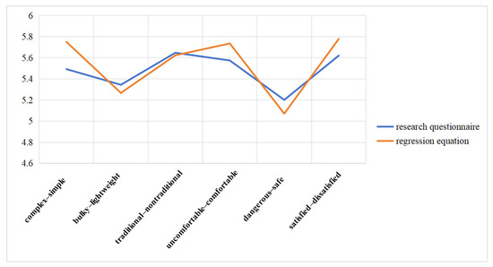 A survey was conducted using a 45-degree frontal view rendering to create a research questionnaire. The questionnaire was distributed to the same group of users who had been previously involved in the research, aiming to eliminate the influence of different user demographics on the evaluation criteria. The questionnaire format remained consistent with a 7-point Likert scale, assessing the aesthetic satisfaction of the new design of the two-wheeled electric scooters. A total of 68 questionnaires were distributed, and 64 valid responses were collected. After organizing the data and calculating the means, the scores for sensory evaluation words regarding the output design proposals are presented in Figure 11. Utilizing the previously fitted sensory evaluation equations, inputting the design categories from the design drawings into the regression model allowed for the calculation of predicted scores for the sensory evaluation words, which were found to be 5.750, 5.267, 5.623, 5.735, 5.071, and 5.778. Furthermore, it is observed that the overall satisfaction with the final design output is higher than the highest satisfaction among the samples in the earlier stages of sensory research (Sample 5: average satisfaction rating of 5.176). Therefore, it can be concluded that the design optimization strategies derived from a combination of sensory engineering and Quantitative Theory I effectively cater to user preferences for the appearance of the target product. This method serves as a scientifically effective means to guide the design optimization of similar products.