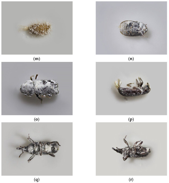 The insecticidal use of DEs dates to 2000 B.C. in China for pest control [34]. Research into their mode of action advanced in the 1930s, revealing that dust particles ingested during insect self-cleaning procedures were toxic [34,35]. Later, DEs were found to cause desiccation upon contact with the insect cuticle [36]. Before this, theories suggested ingestion [37,38], chemical reactions on the cuticle [38,39], or mechanical effects [38] as causes of insect mortality. The rate of dehydration, influenced by epicuticular absorption and DE particle size and shape, was crucial [40]. Initially, DEs were thought to disrupt the epicuticle, but later, their role in absorbing the cuticular wax was identified [41]. In Figure 1a–r are presented various coleopterans of stored products (adults and larvae), such as Tenebrio molitor L., Alphitobius diaperinus (Panzer) (Coleoptera: Tenebrionidae), and Cryptolestes ferrugineus (Stephens) (Coleoptera: Laemophloeidae), that have died after 24 hours (h) of exposure to DE Insecto, having their bodies covered with dust/DE particles. It has been reported that the attached particles of DEs to the insects’ bodies can reduce their movement and block tracheae, spiracles, digestive tract, and genital systems, which can affect sexual interaction and progeny production, as well as prevent other essential operations (e.g., vision and signaling) [1].