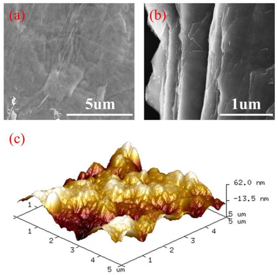 The surface and cross-section images of the multilayer β-CD/GO membrane were investigated using SEM, and the results are shown in Figure 3. As shown in Figure 3a, the multilayer β-CD/GO membrane possessed a continuous and integrated surface. Furthermore, the surface of the multilayer β-CD/GO membrane exhibited a significantly rough and wrinkled morphology. Figure 3b demonstrates that the multilayer β-CD/GO membrane exhibits a tight and multilayered stacking structure with uniformly distributed layers, which could enhance its stability in aqueous solutions. The surface roughness of the multilayer β-CD/GO membrane is depicted in Figure 3c. The image displayed significant fluctuations on the surface of the β-CD/GO membrane [], which is consistent with the results observed via SEM. The rougher surface indicated that the multilayer β-CD/GO membrane was equipped with a large specific surface area, which could expose abundant available adsorption sites for the adsorption of PPCPs.
