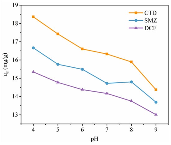 The effect of solution pH values on the adsorption capacity of multilayer β-CD/GO membrane for PPCPs was presented in Figure 4. The results demonstrated that the adsorption capacity of PPCPs onto multilayer β-CD/GO membrane was enhanced under acidic conditions. With increasing pH values, the adsorption capacity decreased slightly. The maximum adsorption capacities of the multilayer β-CD/GO membrane for CTD, SMZ, and DCF at pH 4 were 18.36, 16.66, and 15.35 mg/g, respectively. When the pH value was increased to 9, the adsorption capacities for CTD, SMZ, and DCF decreased to 14.37, 13.69, and 13.01 mg/g, respectively.