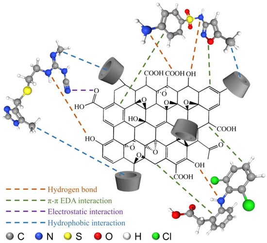The influence of solution pH values on the adsorption capacity of the multilayer β-CD/GO membrane may be attributed to changes in the surface charge of the membrane and the form of PPCPs in solution []. According to a previous study, the zeta potential value of β-CD/GO composite was negative within the pH range of 4–9 []. The possible adsorption mechanisms of multilayer β-CD/GO membrane for CTD, SMZ, and DCF are schematically illustrated in Figure 5. For CTD, which has a pKa of 6.8, two dissociated species exist at different pH values, namely CTD+ (pH < 6.8) and CTD− (pH > 6.8) []. At pH < 6.8, CTD was easily adsorbed onto the membrane surface due to the electrostatic attraction between the negatively charged multilayer β-CD/GO membrane surface and CTD+ molecules. Furthermore, the -NH- group in CTD formed hydrogen bonds with the abundant oxygen-containing functional groups on the multilayer β-CD/GO membrane surface [], which played an important role in the adsorption of CTD. The -CH3 group in CTD was considered a hydrophobic group, thereby enhancing the adsorption of CTD via hydrophobic interactions with the β-CD/GO membrane []. With increasing pH values from 4 to 9, the electrostatic attraction between CTD and the negatively charged multilayer β-CD/GO membrane surface transformed into electrostatic repulsion due to the conversion of CTD+ to CTD− in the solution, resulting in a reduced adsorption capacity for CTD.
