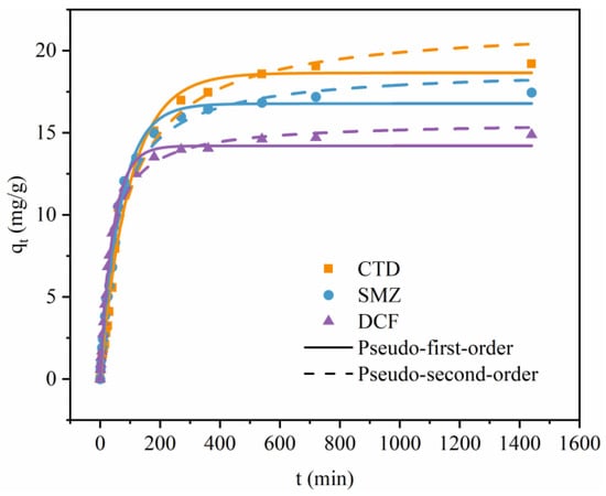 To investigate the adsorption mechanism, pseudo-first-order and pseudo-second-order models were applied to analyze the adsorption process of PPCPs on the β-CD/GO membrane. The corresponding equations for the above two models are presented in Equation (2) and Equation (3), respectively [].