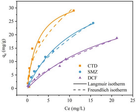 Figure 7 illustrates the adsorption isotherms of CTD, SMZ, and DCF on the multilayer β-CD/GO membrane. At a lower initial concentration of the PPCP solution, the steep slope observed in the isotherms indicated high adsorption efficiencies for CTD, SMZ, and DCF, which were due to the abundant adsorption sites on the multilayer β-CD/GO membrane’s surface []. The adsorption capacities of the multilayer β-CD/GO membrane for CTD, SMZ, and DCF increased with the rising equilibrium concentration of PPCPs. This result was attributed to the higher collision frequency between PPCPs and available adsorption sites on the multilayer β-CD/GO membrane at higher concentrations []. Furthermore, the increase in the concentration of PPCPs in solution enhanced the driving force for PPCPs to overcome the mass transfer resistance between the aqueous and solid phases []. As the concentration of the PPCP solution further increased, the adsorption sites on the multilayer β-CD/GO membrane surface gradually became saturated, and the adsorption finally reached equilibrium.
