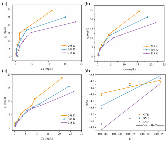 Effects of temperature on the adsorption of CTD (a), SMZ (b), and DCF (c) onto the multilayer β-CD/GO membrane. (d) Van ’t Hoff plot for the adsorption of CTD, SMZ, and DCF onto the multilayer β-CD/GO membrane.