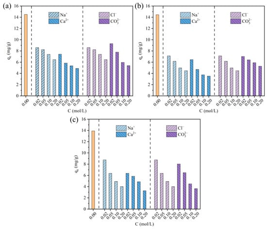 The effects of coexisting ions on the adsorption performance of the multilayer β-CD/GO membrane for PPCPs are shown in Figure 9. The results indicate that the adsorption capacity of PPCPs was only slightly affected by the presence of coexisting ions. Compared to the concentration of 0 mol/L, the adsorption capacities of CTD, SMZ, and DCF slightly decreased to 7.42–9.29, 6.45–7.12, and 6.37–8.75 mg/g at 0.02 mol/L, respectively. With a further increase in concentration to 0.20 mol/L, the adsorption capacities of CTD, SMZ, and DCF marginally decreased to 4.88–6.45, 3.51–5.28, and 3.26–4.00 mg/g, respectively. This result may be due to the weakened electrostatic attraction between PPCPs and the multilayer β-CD/GO membrane, which was caused by the addition of coexisting ions []. In addition, the coexisting ions could occupy active adsorption sites on the multilayer β-CD/GO membrane through ion exchange with PPCPs, which hindered the complete adsorption of PPCPs []. At 0.02 mol/L, the adsorption of coexisting ions on the multilayer β-CD/GO membrane was saturated, and further increasing the ion concentration had no significant effect on the adsorption capacity of PPCPs. The negligible reduction in adsorption capacity was attributed to the increased viscosity and density of the aqueous solution at elevated ion concentrations, which hindered the mass transfer of PPCPs to the multilayer β-CD/GO membrane and thereby reduced the adsorption capacity [].