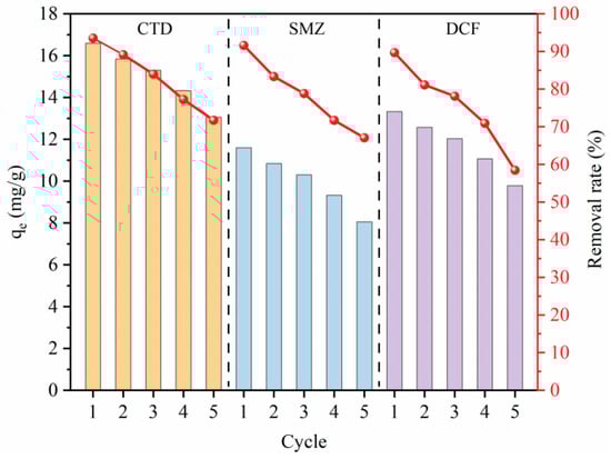 The regeneration of the multilayer β-CD/GO membrane is an important factor in evaluating its practical applications. Five consecutive adsorption–desorption processes were performed for the multilayer β-CD/GO membrane under the same experimental conditions, and the results are shown in Figure 10. The adsorption capacities of CTD, SMZ, and DCF onto the multilayer β-CD/GO membrane during five consecutive cycles were 16.58–13.04, 11.59–8.05, and 13.32–9.78 mg/g, respectively. Compared to the first adsorption, the removal efficiencies of CTD, SMZ, and DCF declined by 21.83%, 24.52%, and 31.24%, respectively. The decrease in removal efficiency could be attributed to the reduction in available adsorption sites on the multilayer β-CD/GO membrane surface after each reuse. However, the removal efficiencies of the multilayer β-CD/GO membrane for CTD, SMZ, and DCF still remained at 58.45–71.73% after five cycles, which confirms the good regeneration ability of the multilayer β-CD/GO membrane.