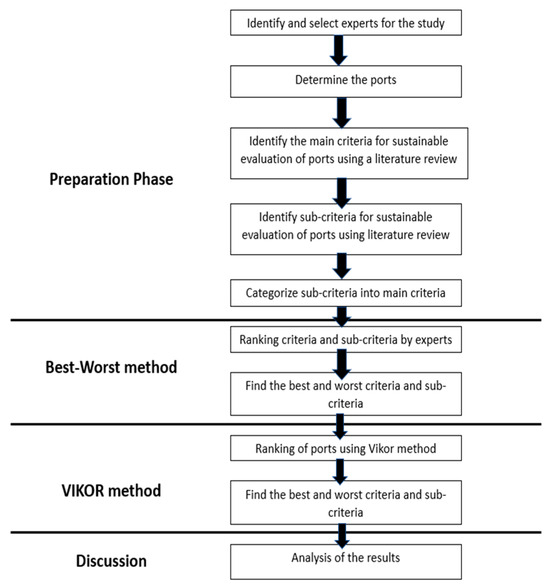 Our study delves deeper into the indicators for assessing the sustainable performance of ports using a combination of the BWM and VIKOR methods. While methods such as the Analytic Hierarchy Process (AHP) and Technique for Order Preference by Similarity to Ideal Solution (TOPSIS) are commonly used in multi-criteria decision-making (MCDM), they involve more intricate pairwise comparisons and require greater computational effort [16,17]. These methods are effective but may not always yield precise results in cases with conflicting criteria. In contrast, BWM simplifies the process by asking decision-makers to identify only the best and worst criteria, reducing the cognitive load. VIKOR, on the other hand, is chosen for its ability to identify a compromise solution, making it well suited for contexts where decision-makers need to balance trade-offs between multiple sustainability objectives.