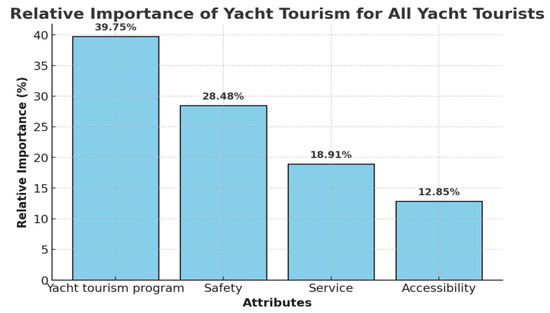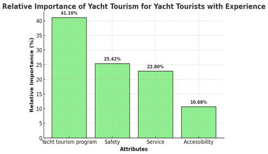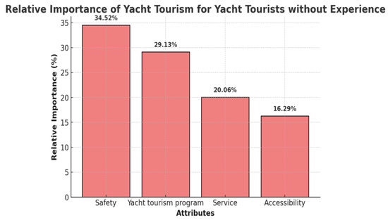 For respondents without yacht tourism experience (See Table 5), safety (34.5%) was rated as the most important attribute, followed by program (29.1%), service (20.1%), and accessibility (16.3%). Part-worth utilities were also estimated for this group. Among the safety attributes, safety training and safety equipment provision (0.460) were the most important. For programs, yacht sailing programs (0.347) were prioritized. Regarding service, operation of a yacht tourism information platforms (online, app) (0.411) was considered the most significant. Finally, in terms of accessibility, locations within one hour of travel via public transportation (city center → marina) (0.301) were selected as the most important level. Pearson’s r value for this group was 0.825 (p < 0.001), confirming the validity of the model. Detailed results are presented in Table 5, while Figure 3 offers a visual representation of the relative importance of each attribute to facilitate better understanding.