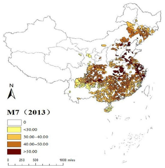 Figure 1 and Figure 2 illustrate the spatial distribution of ozone concentrations across the sampled counties, as measured by M7 during the ozone-sensitive phase of rice growth in 2013 and 2015, respectively. Figure 3 depicts the variations in ozone concentration distribution, also measured by M7, during the same sensitive period from 2013 to 2015.