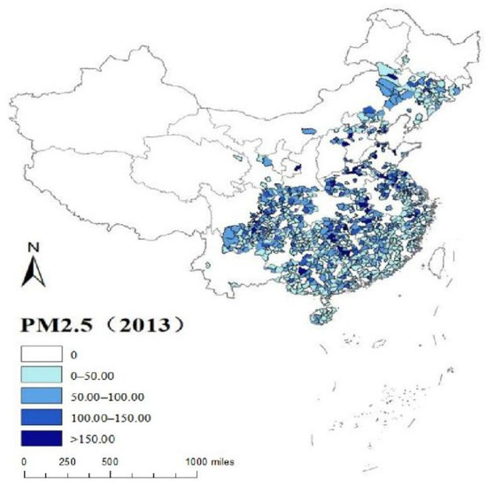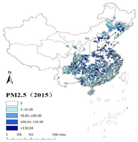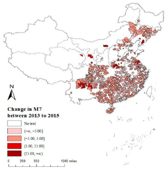 According to Figure 4 and Figure 5, the characteristics and changes in PM2.5 in 2013 and 2015 cannot be observed intuitively. However, from Figure 6, it is observed that compared with 2013, the PM2.5 value in most regions decreased in 2015, which may be attributed to the enforcement of China’s Technical Policy for the Comprehensive Prevention and Control of Fine Particulate Matter Pollution in Ambient Air. At the same time, PM2.5 increased in several regions in 2015 compared to 2013. Figure 6 illustrates this feature more clearly.