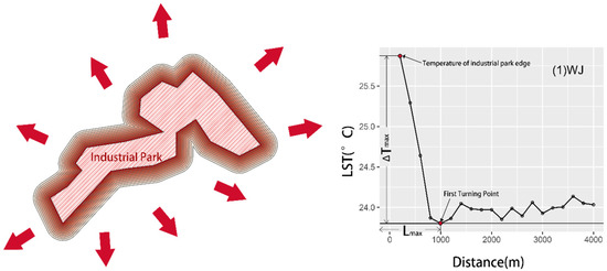 Based on the observed LST profiles and previous studies [25,47,48], we identified four key indicators to quantify the IHIE: Industrial Heat Island Intensity (IHII) was defined as the difference in mean LST between the industrial park and the first turning point [25]; Industrial Warming Area (IWA) referred to the maximum area experiencing warming when the first turning point appears within the buffer zone surrounding the industrial park; Industrial Warming Efficiency (IWE) was defined as the ratio of the maximum warming area to the industrial park area, reflecting the spatial extent of the IHIE; and Industrial Warming Gradient (IWG) referred to the ratio of LST reduction to the warming distance, representing the accumulated temperature increase per unit distance. The specific calculation formulas are as follows: