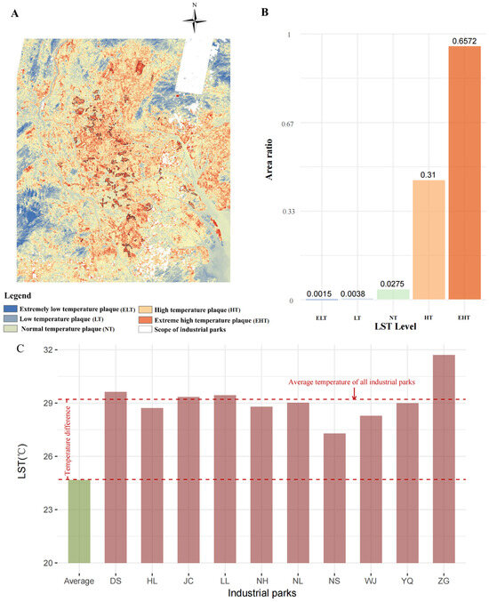(A) Classification of LST in the study area; (B) the area proportion of each LST category in the industrial park; (C) comparison of urban average surface temperature and 10 industrial parks’ surface temperature. The abscissa in (C) is the urban average surface temperature and the abbreviation of the industrial park name. See Table A1 in the Appendix A for specific industrial park information.