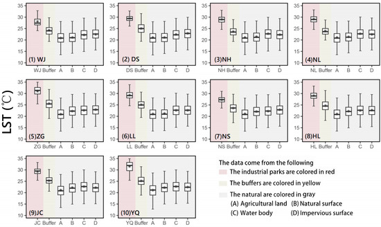 Box plots of LST comparison between industrial parks and surrounding areas in the study area. The black line and the asterisk in the middle of the box block represent the median and mean, respectively.