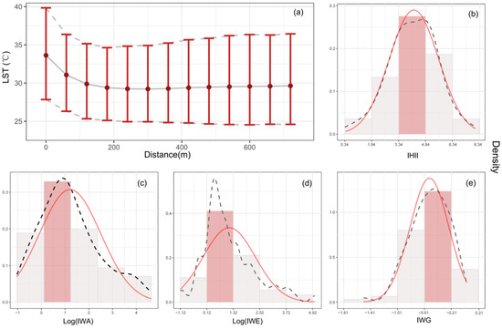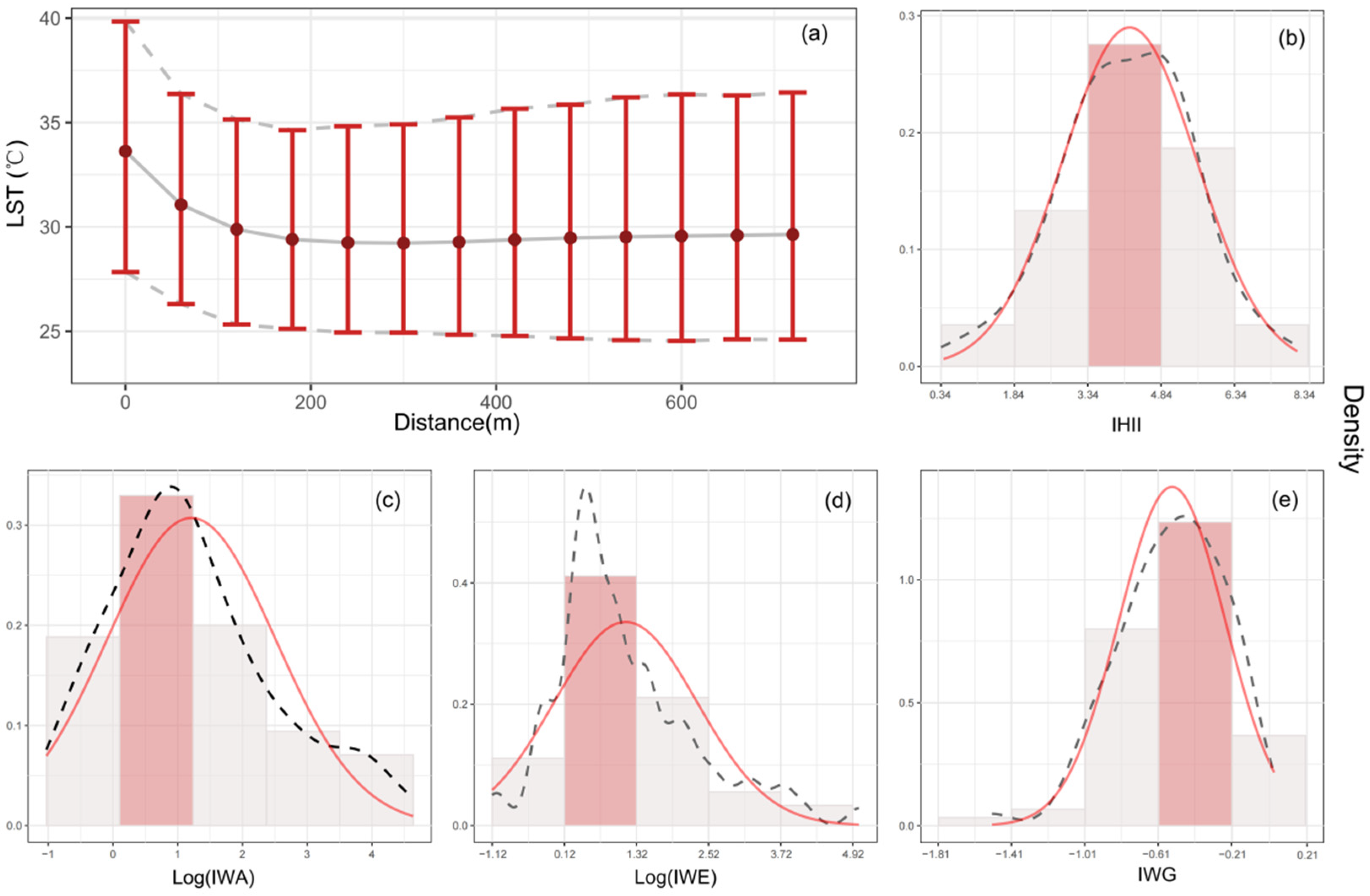 (a) LST profiles of all industrial parks, where the solid black line represents the average temperature profile, while the dashed gray lines depict the average maximum and minimum temperature profiles; the distribution of industrial parks’ (b) IHII, (c) IWA, (d) IWE, and (e) IWG, where the bar represents the industrial park counts and the gray dashed line indicates the probability distribution curve, while the red solid line represents the normal distribution curve. Due to the large data range, IWA and IWE were log-transformed.