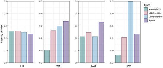 Given the variability in industrial park functions and spatial configurations, this study analyzes IHIE across park types separately. Significant differences were observed in IHIE indices (Figure 7) and internal characteristics (Figure A3). While IHII values were relatively consistent, manufacturing parks exhibited lower IWA, suggesting more concentrated thermal output. Special parks showed higher IWG, likely due to greener buffers and lower structural density. Comprehensive parks had the highest IWE, indicating stronger spatial spread of heat. These differences underscore the importance of type-based classification when analyzing IHIE drivers.