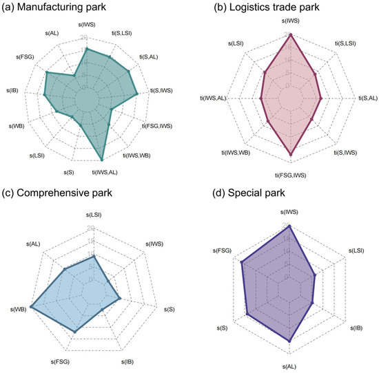 In order to explore what factors (S, LSI, IWS, IB, AL, WB, FSG, and their interaction terms) affect IHIE in different types of parks (manufacturing parks, logistics trade parks, comprehensive parks, and characteristic parks), we calculated the mean p-value of all IHIE indicators versus each impact factor for the different types of parks in the model. Only a few factors were selectively retained to avoid multicollinearity (variance inflation factor < 5).