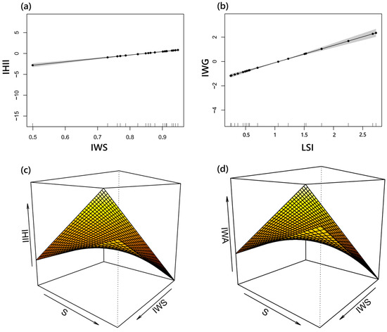 The effects of (a) IWS on IHII, (b) LSI on IWG, (c) interaction of IWS and S on IHII trend, and (d) interaction of IWS and S on IWA trend based on GAM.