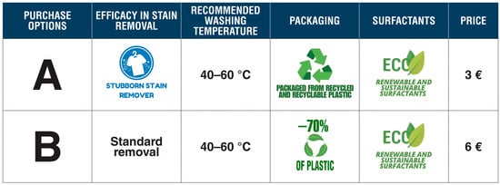 The detergent purchasing choices (1) featured the 12 choice sets generated during the experimental design process. Respondents were instructed to imagine themselves in a supermarket scenario and tasked with selecting a detergent. Each choice set presented two detergent options with distinct attributes, alongside a “none of the above” (no-buy) option to simulate real-world decision-making scenarios. The two purchase options were highlighted using labels to replicate typical shopping conditions and draw attention to key product attributes. Such labels are pivotal for enhancing consumer understanding of sustainability benefits, which aligns with marketing strategies to promote green or bio-based consumer goods. A description of one of the choice cards used in the survey is shown in Figure 1.