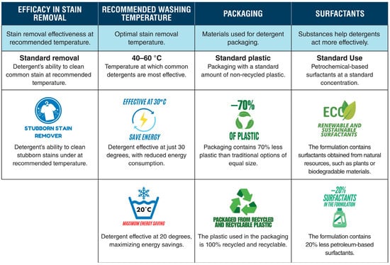 Sustainability has become a critical factor in consumer preferences within the laundry detergent market [,,]. Whitson et al. note a significant shift since 1996 towards preferences for eco-labels and phosphate-free formulations, driven by willingness to pay higher prices for sustainable options []. For instance, a study in Malaysia reported that 79.5% of consumers were willing to pay a premium for eco-friendly laundry detergents []. Similarly, Das and Tyagi, through a study conducted across various countries, identified a growing demand for products that combine high performance, such as effective stain removal and low-temperature cleaning efficiency, with sustainability features—including biodegradability, reduced energy and water use, and eco-friendly ingredients [].