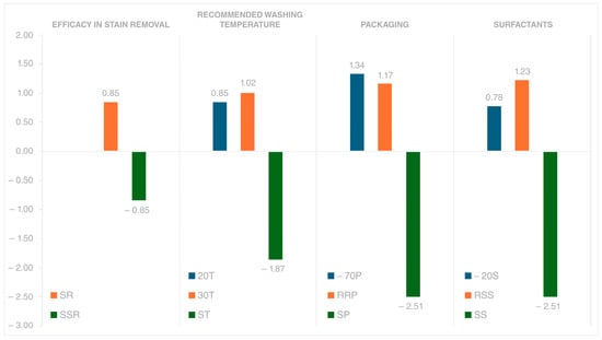 The CLM results reveal significant drivers of consumer choice. The negative coefficient for the alternative-specific constant (−4.24, p < 2 × 10−16) suggests that the “none of the above” option was generally less preferred, highlighting a strong consumer tendency toward active product selection. All coefficients for the attributes that were hypothesized to be improvements over the standard are positive, indicating that there is indeed an increase in utility for these features. This confirms consumer preference for enhanced attributes. Considering the Δ, as shown in Figure 3, or the difference between the high and low coefficients of each attribute, packaging attributes emerge as the most relevant to consumer preferences. The Δ for “Recycled and recyclable plastic” (3.68) and “−70% of plastic” (3.85) significantly surpasses that for “Stain removal efficacy” (1.70) and “Washing temperature” (2.89, 2.72), emphasizing the priority given to sustainable materials. Notably, the Δ for “Washing temperature” (over 2.7) highlights strong interest in energy efficiency, with preferences for “Save energy (30 °C)” and “Maximum energy saving (20 °C)” exceeding those for stain removal efficacy. While the Δ for “Surfactants” is smaller, it still indicates a preference for fully renewable options. Despite price sensitivity (coefficient: −0.55344), the large Δ values for sustainability and efficiency suggest that consumers are willing to pay more for environmentally friendly and energy-efficient products. These insights provide clear directions for sustainable product design and marketing strategies.
