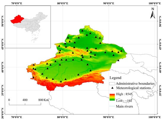 Xinjiang, located in the northwest border region of China and the heart of the Eurasian continent (73°20′ E to 96°25′ E, 34°15′ N to 49°10′ N), covers one-sixth of China’s total land area, making it the largest of China’s provincial-level administrative regions [17] (Figure 1). The region features a complex topography that includes high mountains, basins, rivers, lakes, deserts, Gobi plains, and oases [18]. Xinjiang has a temperate continental arid climate, with an annual average temperature ranging from 6.2 °C to 9.0 °C and annual precipitation between 93.2 mm and 205.8 mm [19]. It benefits from abundant light and heat resources but suffers from low rainfall and high evaporation rates, making it one of China’s most climate-sensitive and ecologically vulnerable areas [20]. Thanks to its unique geographical and climatic conditions, advancements in science and technology, and strong national policy support, Xinjiang achieved remarkable success in cotton production [18,21]. In 2022, Xinjiang planted cotton on 2.5 million hectares, accounting for 83.2% of the national planting area, with a total output of 5.394 million tons, representing 90.2% of the national total. The yield reached 2016.0 kg per hectare, the highest in the country [21]. In 2023, the total cotton production was 5.112 million tons, exceeding 90.0% of the national total, establishing Xinjiang’s position as China’s most important cotton-producing region [22].