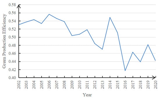 As shown in Figure 2, despite a sharp increase in Xinjiang’s green cotton production efficiency to 0.549 in 2014, which remained relatively stable between 2016 and 2020, the overall trend of green production efficiency from 2002 to 2020 exhibited a downward trajectory. This notable surge in 2014 coincided with the implementation of the “Cotton Target Price Reform Pilot” policy in Xinjiang. Although primarily aimed at adjusting price mechanisms and securing farmers’ incomes, this policy indirectly enhanced green production efficiency by motivating improvements in production efficiency, facilitating adjustments in planting structures, and guiding market orientation. Between 2016 and 2020, the Chinese government actively promoted green agricultural development through various measures, including reducing fertilizer usage, enhancing efficiency, and advancing ecological agriculture, all of which were aimed at fostering sustainable development within the cotton industry. These initiatives indirectly or directly contributed to stabilizing and improving green production efficiency. However, the average green production efficiency for cotton in Xinjiang declined from 0.531 in 2002 to 0.442 in 2020, with an annual average decline rate of −0.882%. The decline could be attributed to farmers’ intensive use of chemical fertilizers and other agricultural chemicals in pursuit of higher yields and production efficiency. This practice resulted in soil degradation and environmental pollution, both of which are detrimental to green cotton production.
