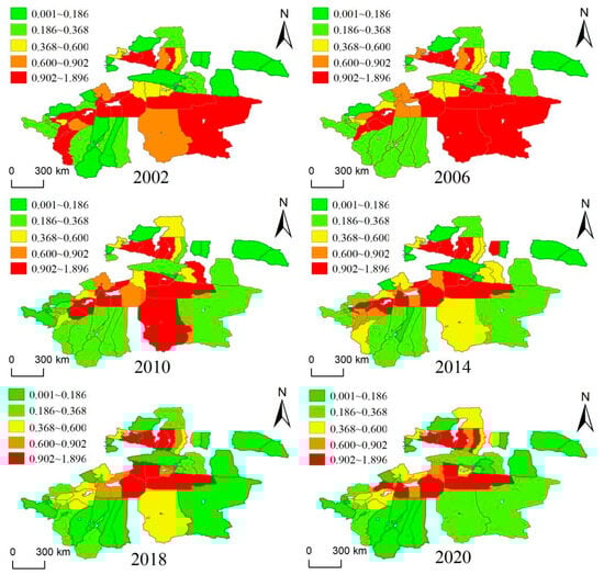 As shown in Figure 3, ARCGIS 10.7 software was used to generate spatial distribution maps of cotton green production efficiency. The natural breaks classification method was applied to categorize the efficiency levels into five classes: low efficiency, sub-low efficiency, medium efficiency, sub-high efficiency, and high efficiency. Spatial distribution maps for cotton green production efficiency in Xinjiang counties (cities) were created for six selected time points: 2002, 2006, 2010, 2014, 2018, and 2020.
