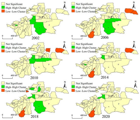 Further analysis revealed that the global Moran’s I values for cotton green production efficiency across counties and cities in Xinjiang exhibited a characteristic of initially rising, then declining, and subsequently rising again, indicating that the degree of spatial correlation was unstable. From 2002 to 2010, the global Moran’s I increased and reached its maximum value. During this period, modern agricultural technologies and green production practices (such as drip irrigation technology and biological control) were widely adopted across counties and cities in Xinjiang, leading to synergistic effects among neighboring counties and cities in adopting similar strategies and technologies, and the degree of agglomeration continued to strengthen. From 2010 to 2014, the global Moran’s I showed a downward trend and reached its minimum value. Over time, continuous high-intensity production increased ecological and environmental pressures, exacerbated pests and diseases, and led to a continued increase in the use of agricultural chemicals such as fertilizers. This resulted in diminishing marginal benefits of cotton production and increased spatial variability. From 2014 to 2020, Moran’s I once again showed an upward trend. During this period, the government vigorously promoted and implemented integrated water and fertilizer management, the substitution of organic fertilizers for chemical fertilizers, and green pest control technologies, which mitigated the contradiction between cotton production and resource exploitation, indirectly or directly promoted sustainable cotton production, increased the positive externalities of cotton green production efficiency, and narrowed the differences in green production efficiency among neighboring counties and cities.