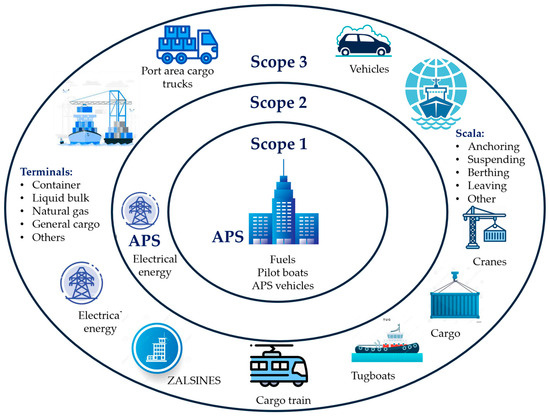 Scope 1 [28] considers the consumption of fossil fuels used by the Ports of APS for land and maritime activities carried out within the jurisdiction area. Scope 2 [28] encompasses the electricity consumption calculated based on the purchase and sales by APS. Scope 3 [28] involves the calculation of energy consumption for the maritime and land transport activities at each terminal, in addition to its electricity consumption. While the calculation of Scope 3 encompasses indirect emissions, it is crucial for the establishment of effective emission reduction policies at the port. This is due to the fact that it enables the identification of the main emission sources associated with the concessionaires and the implementation of joint measures [14].