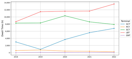 - The year 2021 has the largest energy and carbon footprint values. This can be explained by the increase in anchoring and berthing times in most of the terminals (Figure 4) [45].