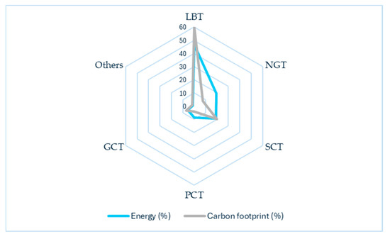The Port of Sines features five specialized terminals with private concessions, including the Containerized Cargo Terminal (SCT), Liquid Bulks Terminal (LBT), Liquefied Natural Gas Terminal (NGT), Petrochemicals Terminal (PCT), and Multipurpose/General Cargo Terminal (GCT). This last terminal replaced, in 2022, the previous Dry Bulk Terminal (DBT). Additionally, the “Others” category encompasses the Sports and Fishing Port, the tugboat service concession, and electrical services provided to the Sines Industrial and Logistics Zone (ZALSINES). These entities possess a variety of maritime and inland infrastructures, technologies, and inland transport modes for their cargo, among other attributes. The aforementioned factors result in a calculation of energy consumption and carbon footprint that is differentiated for each terminal [42]. Table 2 and Figure 2 provide a description of the terminals and, in general terms, the aspects considered in each scope in the methodology.
