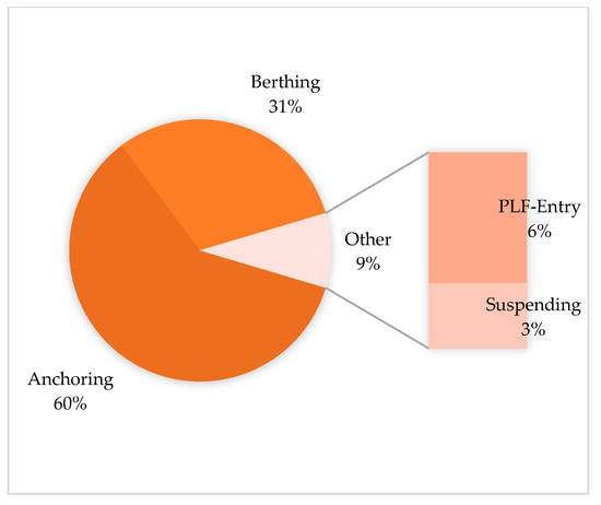 The calculation of the emissions is carried out based on the information regarding the type of ship, the fuel used, and the time duration of the maneuvers, according to the methodology recommended in the European Environment Agency (EEA) [33]. This methodology involves the calculation of the energy consumption and emissions as a function of the power and load factors of the ME and auxiliary engine (AE) of the ship, as well as the execution time of each maneuver within the AJAPS. The load factor, AE/ME proportion, and fuel type are also considered. In this methodology, the AE is estimated as a percentage of the ME depending on the type of ship, regarding the EEA [33].