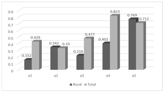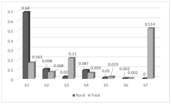 Figure 2 shows that rural residents’ financial skills are not as good as the general population’s. In terms of the proportion of people using online lending platforms (b7), the proportion of rural residents is 0, which is far lower than the general proportion of 0.514. Second, the proportion of rural residents and the general population using financial management products (b3) is 0.02 and 0.21, respectively, and the proportion of rural residents and the general population who hold stock accounts (b5) is 0.01 and 0.19, respectively. However, in terms of using mobile phones that can access the internet (b1), the proportion of rural residents reached 0.680, which is far greater than the general population proportion of 0.163. This may be the result of the government-led and multiparty promotion of the rural internet in recent years in view of the significant impact of the digital divide on the urban–rural dual structure. Additionally, the proportion of rural residents and the general population holding credit cards (b2) is 0.098 and 0.068, respectively; the proportion of rural residents and the general population that understands stocks, bonds, and funds (b4) is 0.087 and 0.059, respectively; and the proportion of rural residents and the general population holding funds (b6) is 0.003 and 0.001, respectively. Although urban and rural residents have basically met the conditions for digital infrastructure, there is still a large gap in the proportion of those who hold credit cards and use financial management products. In particular, there is still much room for improvement in rural residents’ willingness to use online lending platforms.
