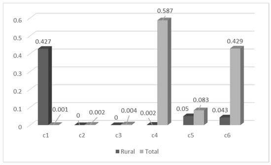 In terms of digital skills and the use of digital financial products, as shown in Figure 3, the proportion of rural residents is lower than that of the overall population. The proportion of rural residents and the general population using mobile payments (c1) is 0.427 and 0.001, respectively, which is higher for rural residents than for urban residents. This is closely related to the popularization of mobile internet and the continuous improvement of financial services in rural areas in recent years. The proportion of rural residents and the general population applying for bank loans (c2) through online banking and other APPs is 0 and 0.002, respectively; the proportion of rural residents and the general population obtaining education, medical, and vehicle loans through the internet (c3) is 0 and 0.004, respectively; the proportion of rural residents and the general population borrowing funds through online loan platforms (c4) is 0.002 and 0.587, respectively; the proportion of rural residents and the general population holding internet financial products (c5) is 0.05 and 0.083, respectively; and the proportion of rural residents and the general population obtaining income through internet financial products (c6) is 0.043 and 0.429, respectively. The proportion of those using mobile payments, applying for bank loans through online banking and other APPs, obtaining education, medical, and vehicle loans through the internet, and holding internet financial products is very low, especially for rural residents, who apply for bank loans through online banking and other APPs and obtain education, medical, and vehicle loans through the internet, all of which are 0. This may be due to the relatively weak economic conditions in rural areas, and borrowing from online lending platforms may increase their financial burden and interest rates, which they are unable to bear. Additionally, the relatively conservative social atmosphere and economic environment in rural areas make farmers unwilling to use the internet to trade with strangers.