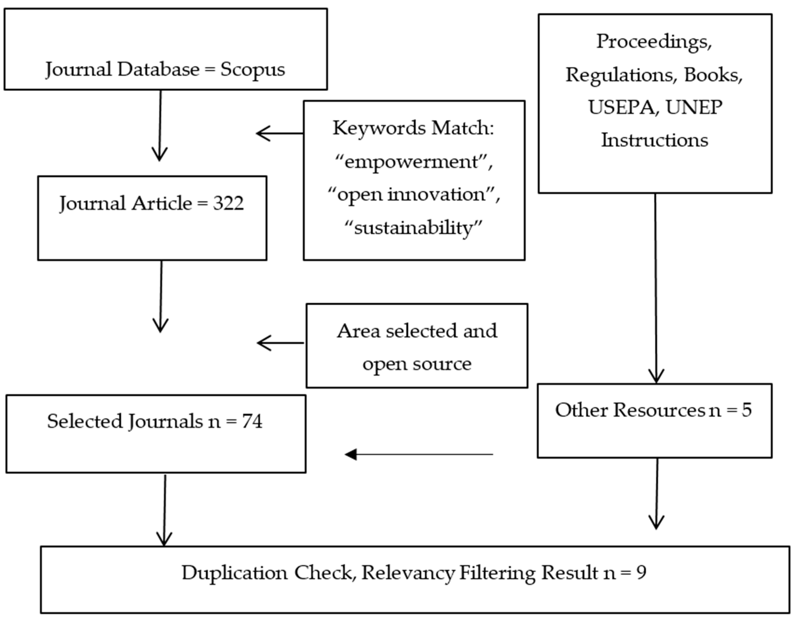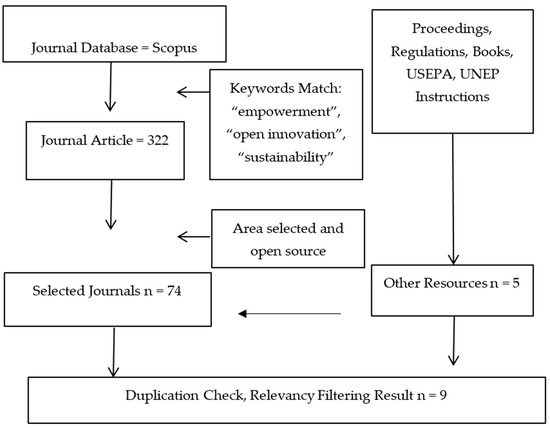 The search for relevant articles is conducted using the keywords: “Empowerment”, “Open Innovation”, and “Sustainability”. The search criteria include titles, abstracts, and keywords, ensuring relevance to the research theme. The study employs inclusion and exclusion criteria to refine the search and select only the most pertinent studies. These criteria are detailed in Table 1.